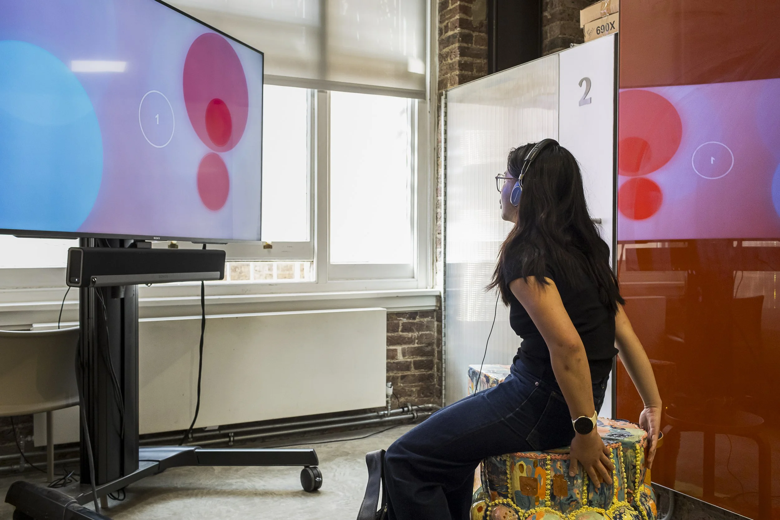 The Family Jelly stools had touch points, each emitting a different musical note, allowing participants to play them. There was a screen with a metronome and bubble illustrations, which could be watched while each note was being played.